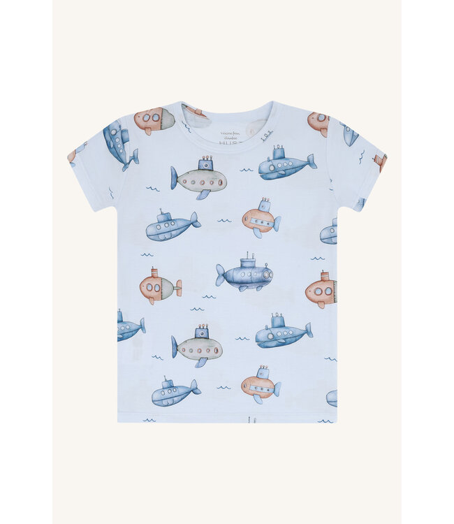 Das Shirt ist farblich harmonisch abgestimmt und mit schönen grafischen Ubooten bedruckt.