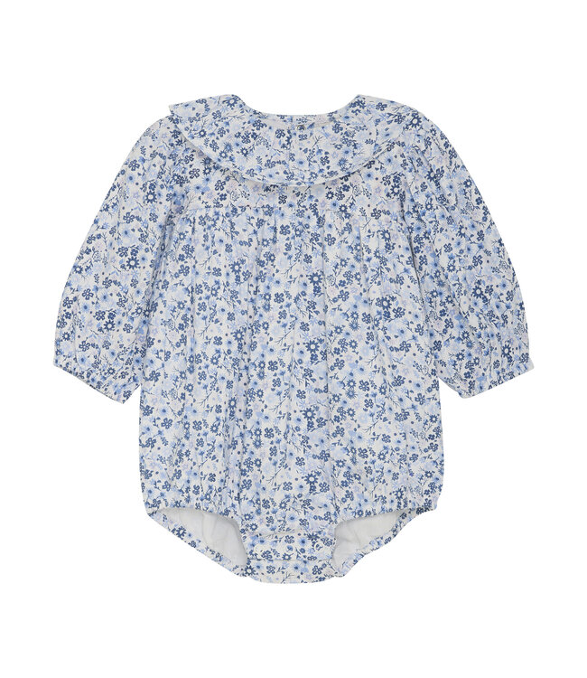 Langarmbody aus gewebter Baumwolle im nordischen Look. Der lockere Schnitt mit Blumendruck ist besonders bequem zu tragen. Mit einem Kragen, Raffungen und Druckknöpfen am Rücken und im Schritt. Zweilagig verarbeitet. Von der dänischen Marke Minymo.