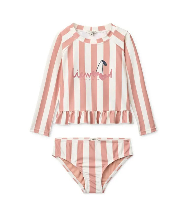 Das langärmlige Oberteil sorgt für zusätzlichen Schutz vor Sonneneinstrahlung, während das Bikinihöschen klassisch geschnitten ist und sicher sitzt, ohne einzuengen. Das gesamte Set ist funktional, durchdacht und gleichzeitig ästhetisch reduziert gestaltet – typisch Liewood.