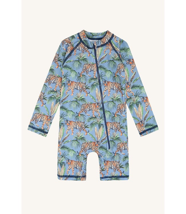 Der UV-Anzug von Hust and Claire kombiniert ein lebendiges Tigerdesign mit funktionalem Schnitt. Der schräg verlaufende Reissverschluss sorgt für einen frechen Look und macht das An- und Ausziehen besonders einfach – auch im nassen Zustand, da der Stoff kaum an der Haut klebt. Lange Ärmel schützen zuverlässig, während die kurzen Beine für angenehme Leichtigkeit sorgen.