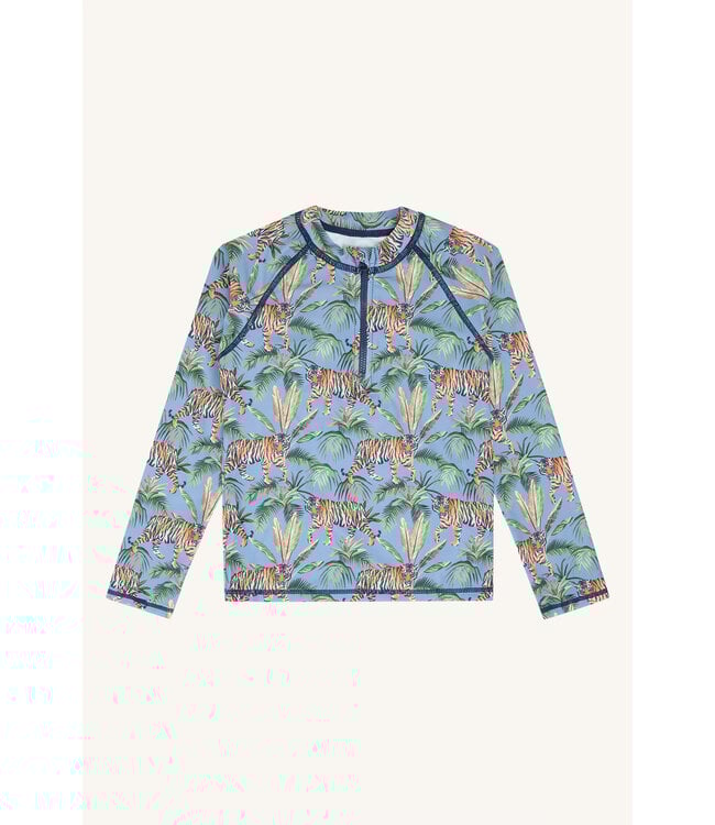 Das UV-Shirt von Hust and Claire überzeugt mit einem tropischen Design aus Tigern und Palmenblättern – lebendig, verspielt und perfekt für sonnige Tage am Wasser.