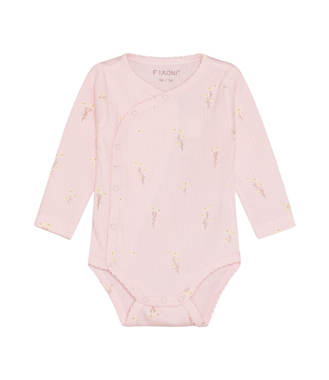 Gerippter Fixoni Wickelbody mit langen Ärmeln und zartem Blumendruck. Gefertigt aus einem besonders hautfreundlichen Modal-Baumwoll-Mix, überzeugt der Body durch seine feine, weiche Qualität und ein angenehm ausgeglichenes Tragegefühl – ideal für empfindliche Babyhaut.
